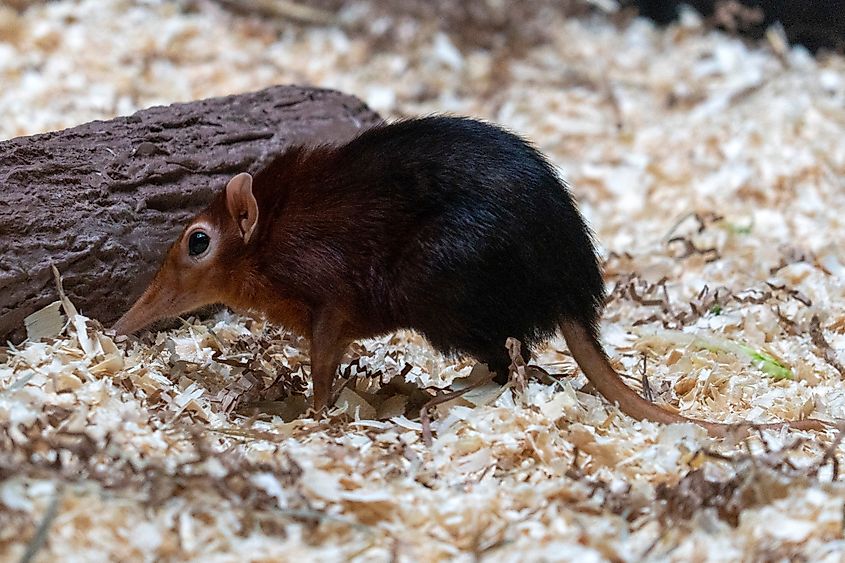 The shrew has glossy chestnut fur and a golden patch above its tail. As one of the largest elephant shrew species, it has a total length of up to 20 inches. Compact and agile, it constructs narrow trails through dense undergrowth, enabling quick escapes from predators. To hunt, its elongated snout probes leaf litter for insects and spiders. The IUCN lists it as endangered due to deforestation and habitat fragmentation. Forest restoration and targeted research support population recovery.
