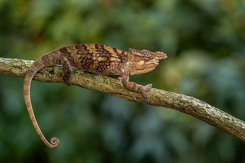 Bohme's two-horned chamaeleon (Kinyongia boehmei) is a medium-sized reptile that survives in the mountainous forests of southeastern Kenya, especially the Taita Hills. Its body is a greenish brown, but it can display a variety of mottled colorations. Males have two small cranial "horns" on the nose. It feeds on insects and small arthropods, capturing prey with a long, sticky tongue.