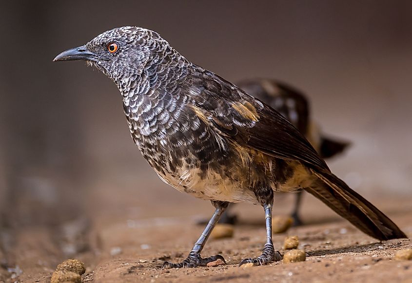 Found in central Kenyan dry forests, Hinde's babbler (Turdoides hindei) is a highly social songbird known for its constant chattering. This species makes its home within thickets, remnant natural forests, and shrubland around Mt. Kenya, the Abedares, and Machakos. It displays earthy brown feathers streaked with pale mottling on the head, throat, and chest. It has red-orange eyes, a black beak, and a cream-white belly.