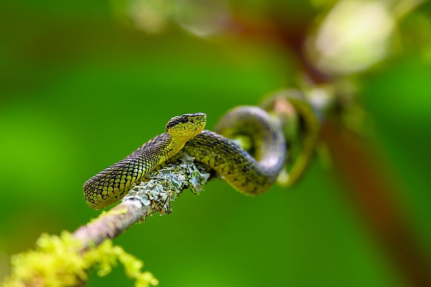The Talamancan palm pitviper (Bothriechis nubestris) is a venomous snake found only in Costa Rica's montane and lower cloud forests, especially in the Talamanca mountains. Adults reach around 24 to 32 inches in length. It has a slender, muscular body covered in green or green-yellow scales that are excellent camouflage among ferns and palms. Its triangular head has heat-sensing pits that help locate prey in low-light conditions. Its flexible tail allows it to grasp and curl around branches while hunting.