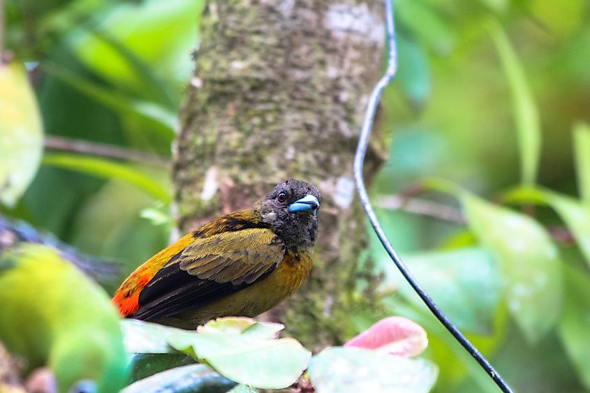 This medium-sized songbird has a dark-gray body with a red tinge and a salmon-orange chest and throat. It feeds on insects and other small invertebrates gleaned from foliage. Fruit is also a small part of its diet. Ongoing deforestation within its narrow habitat has placed this species at risk.