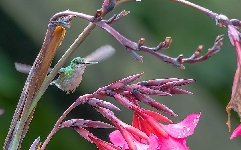 Males show bright green plumage with subtle golden highlights. Their throats flash a faint blue in sunlight. Females appear slightly duller but share the same iridescent tones. Insects and spiders supplement their sugary diet, adding protein to support high-energy flight. Coastal development and mangrove deforestation threaten the survival of this vulnerable species.