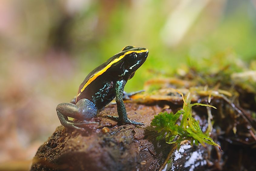 The Golfodulcean poison dart frog (Phyllobates vittatus) lives on the humid forest floor of Costa Rica's southern Pacific coast. It especially inhabits the Golfo Dulce region. Its body is black marked with vivid yellow or orange stripes down its back that signal toxicity to predators. A light blue stripe runs down its sides and the legs are speckled light blue. This small amphibian stays close to streams and damp leaf litter, where moisture supports skin respiration and breeding.