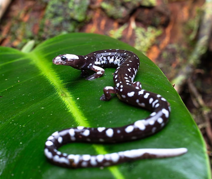 Its elongated body and tiny limbs support efficient movement through leaf litter, the crevices of fallen logs, and soil. Dense forest canopy and consistently damp conditions are essential for survival, as it breathes entirely through its skin. Its body is dark brown to black with lighter mottling along the sides and white splotches near the head. This nocturnal amphibian feeds on small invertebrates, including insects, mites, and worms. It uses quick strikes to capture prey.
