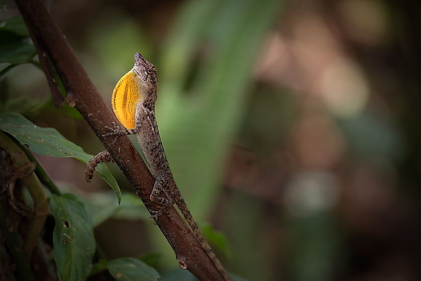 Like many anoles, males possess a throat fan, or dewlap, used for communication and territorial displays. This species dwells in the forest understory and low vegetation. It hunts small insects and other arthropods as it moves stealthily among leaves and branches.