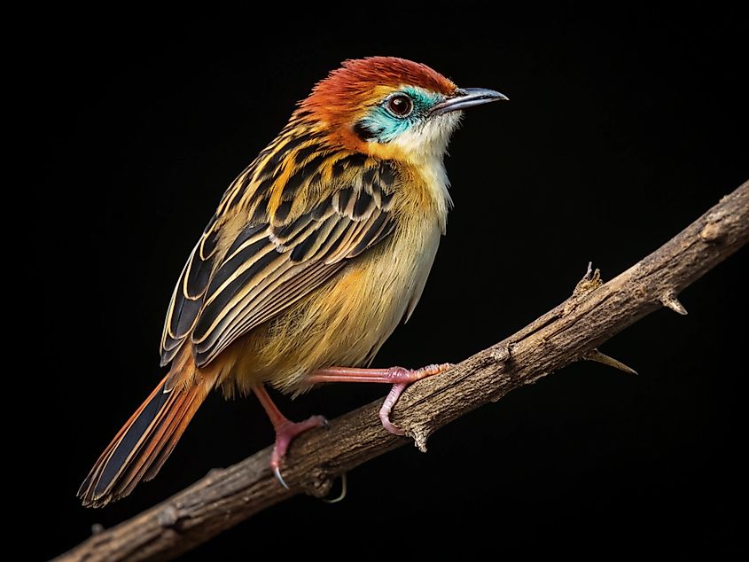 The Sharpe's longclaw (Macronyx sharpei) bird inhabits the highland Kinangop Plateau, Mau Narok, and Uasin Gishu grasslands. This endemic bird has a golden-yellow throat, chest, and belly. Its upperparts and tail feathers are cinnamon brown and rufous with black streaks and cream-yellow edges.