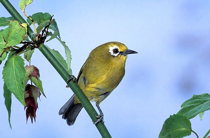 The Kikuyu white-eye (Zosterops kikuyuensis) is a small songbird found in the central Kenyan highland forests, scrub, and woodland edges. It can be found between 4,500 and 11,000 feet in elevation. It has an olive-green back and head, a yellowish underbelly, grey tail feathers, and a prominent white eye-ring.