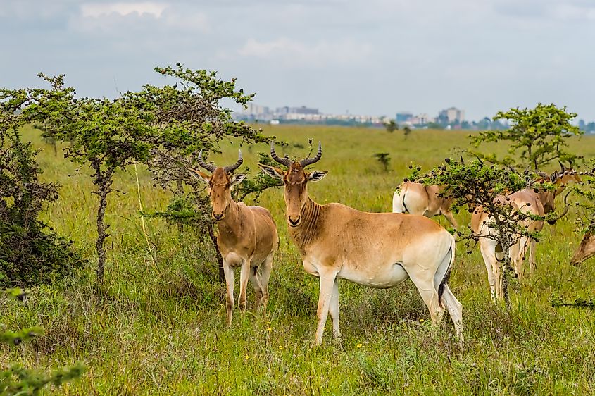 The Hirola antelope (Beatragus hunteri) is native to northeastern Kenya. Its historical range included southwestern Somalia, but today it is found only within Kenya's borders. It is medium-sized with a tawny coat and finely marked facial patterns. Both sexes carry slender, lyre-shaped horns that curve slightly backward. The antelope grazes on short grasses, selecting young shoots rich in nutrients to sustain it. It is known to use abandoned termite mounds as lookout points, exploiting elevated ground to detect predators across flat grasslands.