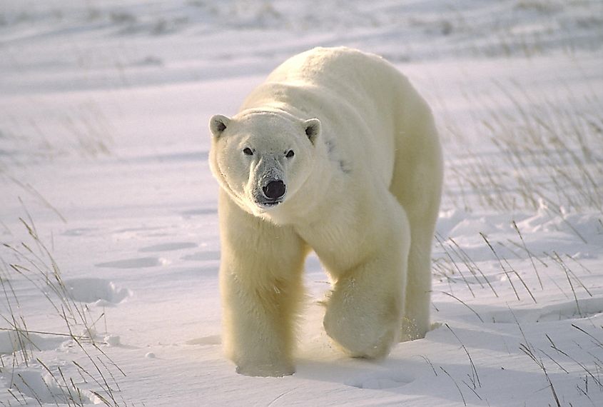 Polar bears rank as one of the largest land carnivores on Earth. Adult males can exceed 1,500 pounds in weight. They can reach more than 8 feet in height when standing on hind legs. Females weigh about half that mass.