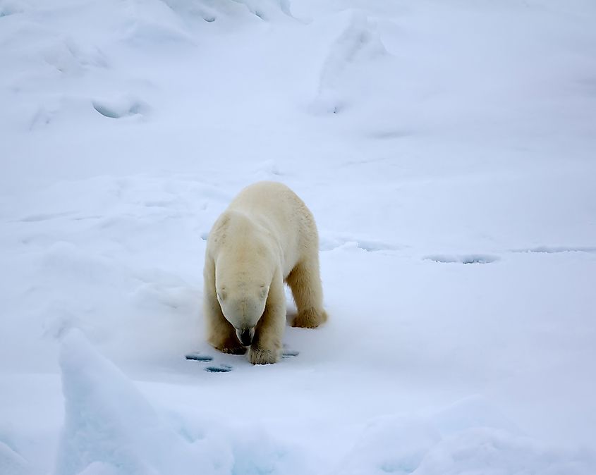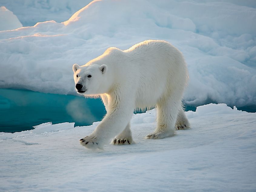 A dense underfur layer traps warm air close to the body. Above it sits a longer outer coat that sheds water after swimming. This insulation helps polar bears survive Arctic temperatures far below freezing. Their large paws are another important adaptation. Each paw can exceed 12 inches across. This helps spread their body weight across ice surfaces and functions like natural snowshoes. Rough pads and small bumps on the soles of their feet increase traction on slick ice.