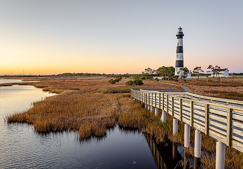 The Hatteras-Ocracoke Ferry provides transportation to the remote Ocracoke island. The black-and-white swirl striped Cape Hatteras Lighthouse is the tallest brick beacon in the US. The Graveyard of the Atlantic Museum is home to exhibits on Civil War history, the Hatteras Lifesaving Station, local piracy, and the region’s many shipwrecks.