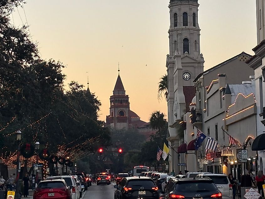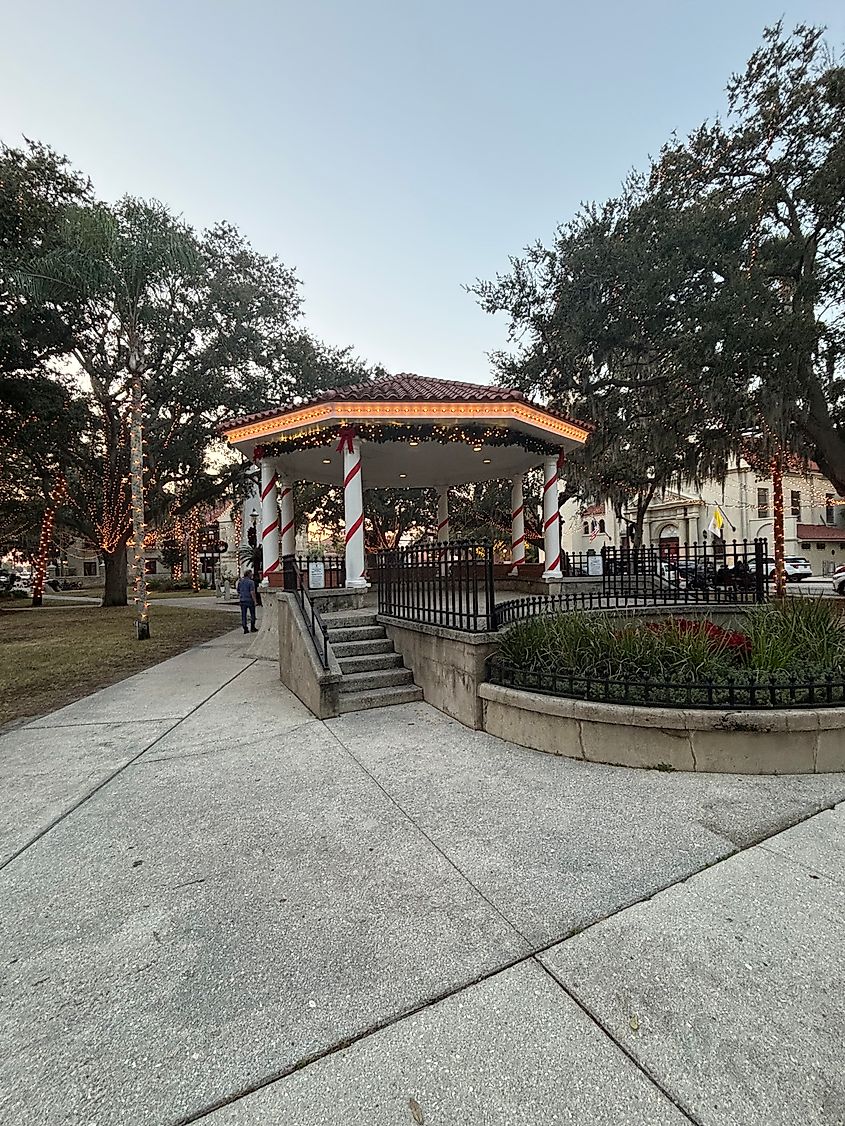 St. George Street leads to the Plaza de la Constitución, the town's focal point and public square for hundreds of years. Once the Public Marketplace, where freshwater and merchants served Spanish settlers, it now serves as the epicenter of the Nights of Lights celebration. The plaza is at the base of the Bridge of Lions and is home to the city's Christmas tree. A war memorial, gazebo, and city well, along with historical markers, are also here, providing a sense of the past and a peaceful respite. Many notable structures, including Cathedral Basilica, Trinity Episcopal, and the Government House, surround the park, giving it an ethereal quality. The gazebo is a nice touch, presenting a platform for sightseers to climb its steps and view the surrounding structures from a higher vantage point.